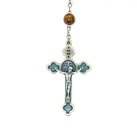 São BentoSão BentoTerço madeira azul cordão marrom escuro cruz de madeira com medalha de São Bento prata - Medjogorje