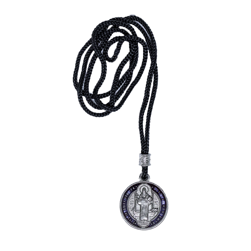 O colar possui uma Medalha de São Bento em metal, na cor prata com um cordão preto segurando a cruz. A medalha de São Bento não é um “amuleto da sorte”. Trata-se de um sacramental, isto é, um sinal visível de nossa fé.
