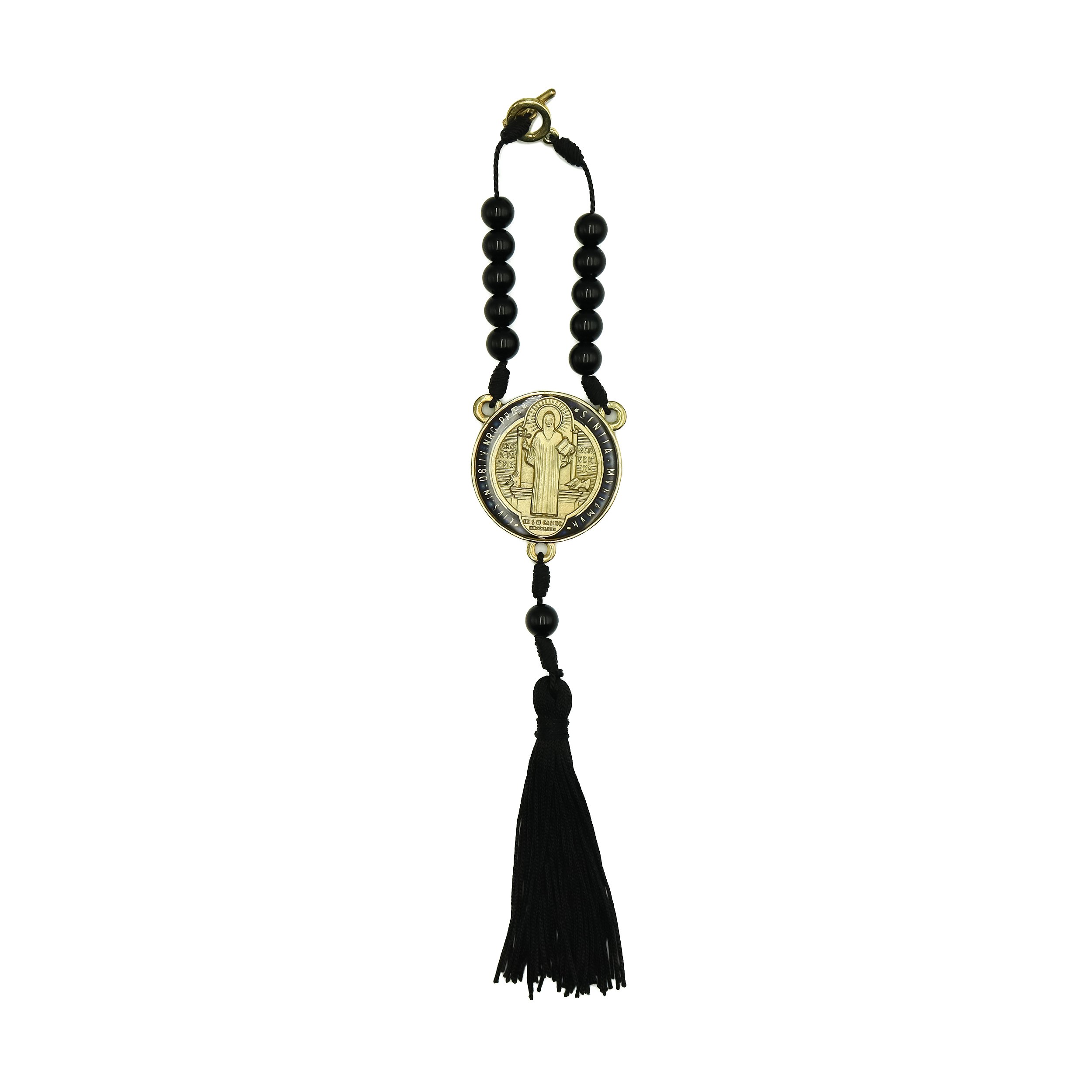 Conheça o Adorno para Carro com a Medalha de São Bento resinada, com contas em preto e metal dourado. Leve a proteção de São Bento para todos os seus trajetos com este elegante adorno para carro.