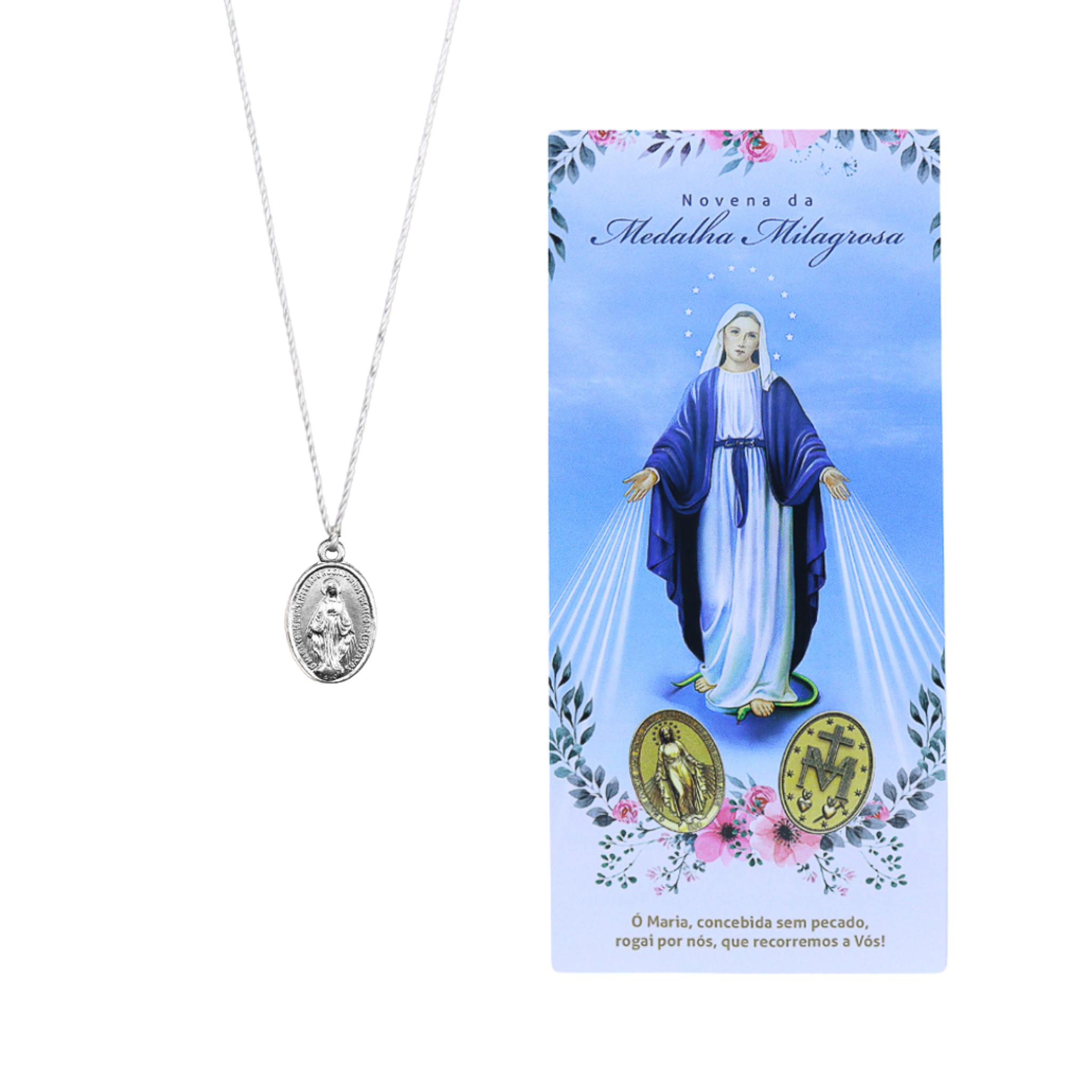 A Novena Medalha Milagrosa é um convite a mergulhar na poderosa devoção a Nossa Senhora das Graças, levando aos fiéis o símbolo de sua intercessão constante. Confeccionada em alumínio prata de alta qualidade, a medalha é acompanhada de um cordão branco, que representa pureza e entrega, além de um folheto com orações para guiar seu coração durante os nove dias de súplica.
