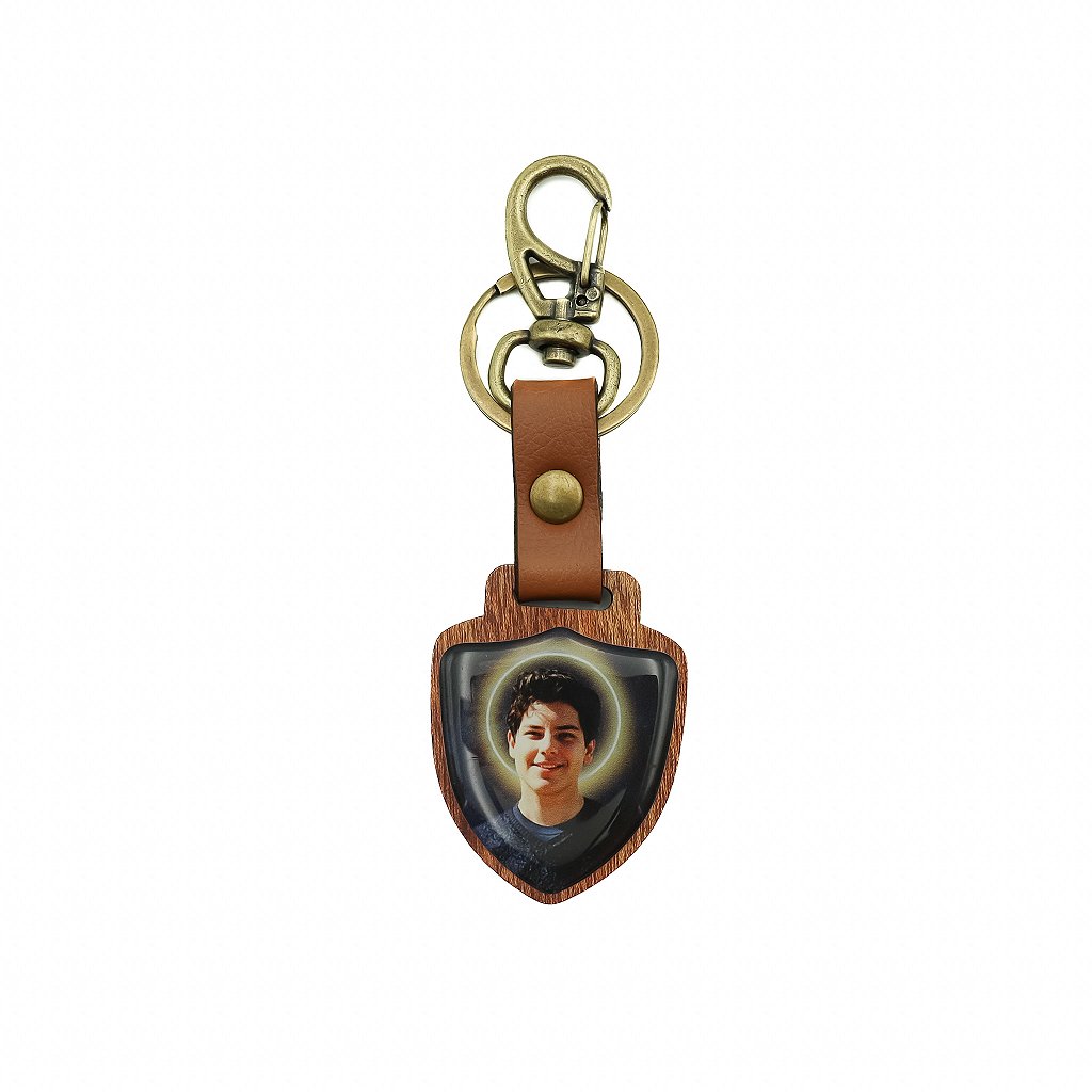 Chaveiro Escudo de Madeira Carlo Acutis Ouro Velha