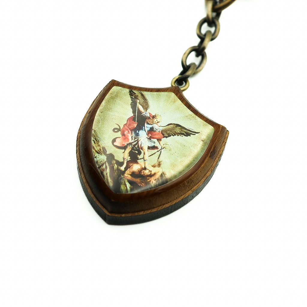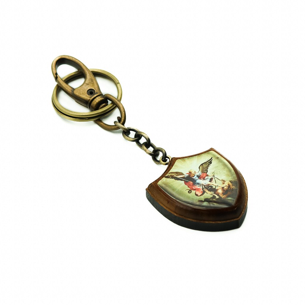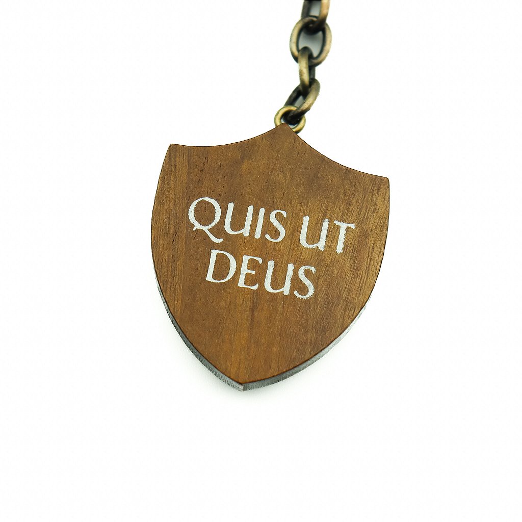 Carregue consigo o símbolo da proteção celestial com este belo chaveiro em madeira, com o poderoso Escudo de São Miguel Arcanjo. Produzido com material resistente e acabamento resinado, ele traz em destaque o tradicional escudo com a oração "Quis ut Deus?" – "Quem como Deus?", lema de São Miguel.