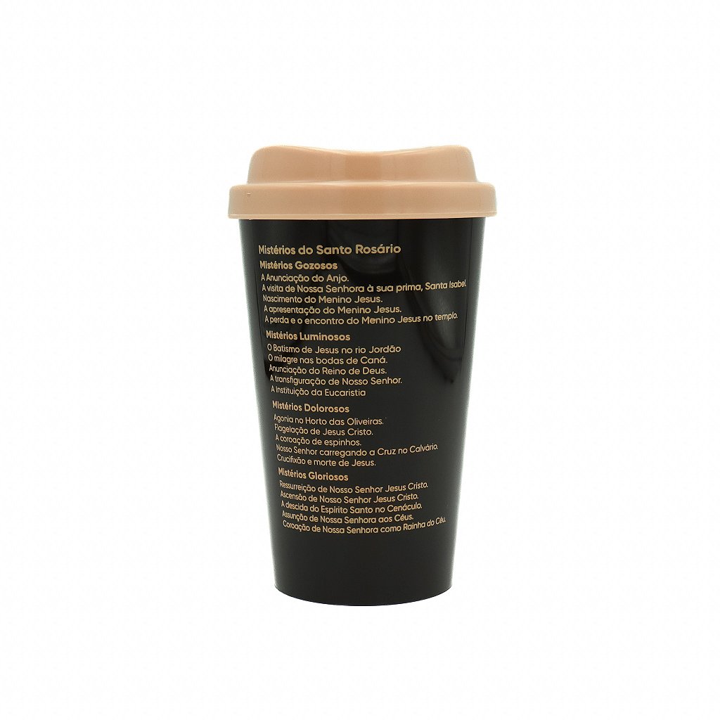 O Copo café do Rosário vem com os Mistérios do Rosário para que você possa vivenciar este momento tão importante do dia rezando e meditando os santos mistérios da vida de Jesus.