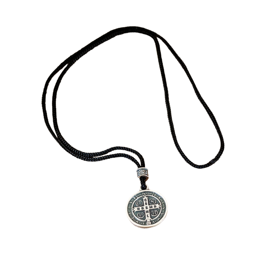 O colar possui uma Medalha de São Bento em metal, na cor prata com um cordão preto segurando a cruz. A medalha de São Bento não é um “amuleto da sorte”. Trata-se de um sacramental, isto é, um sinal visível de nossa fé.