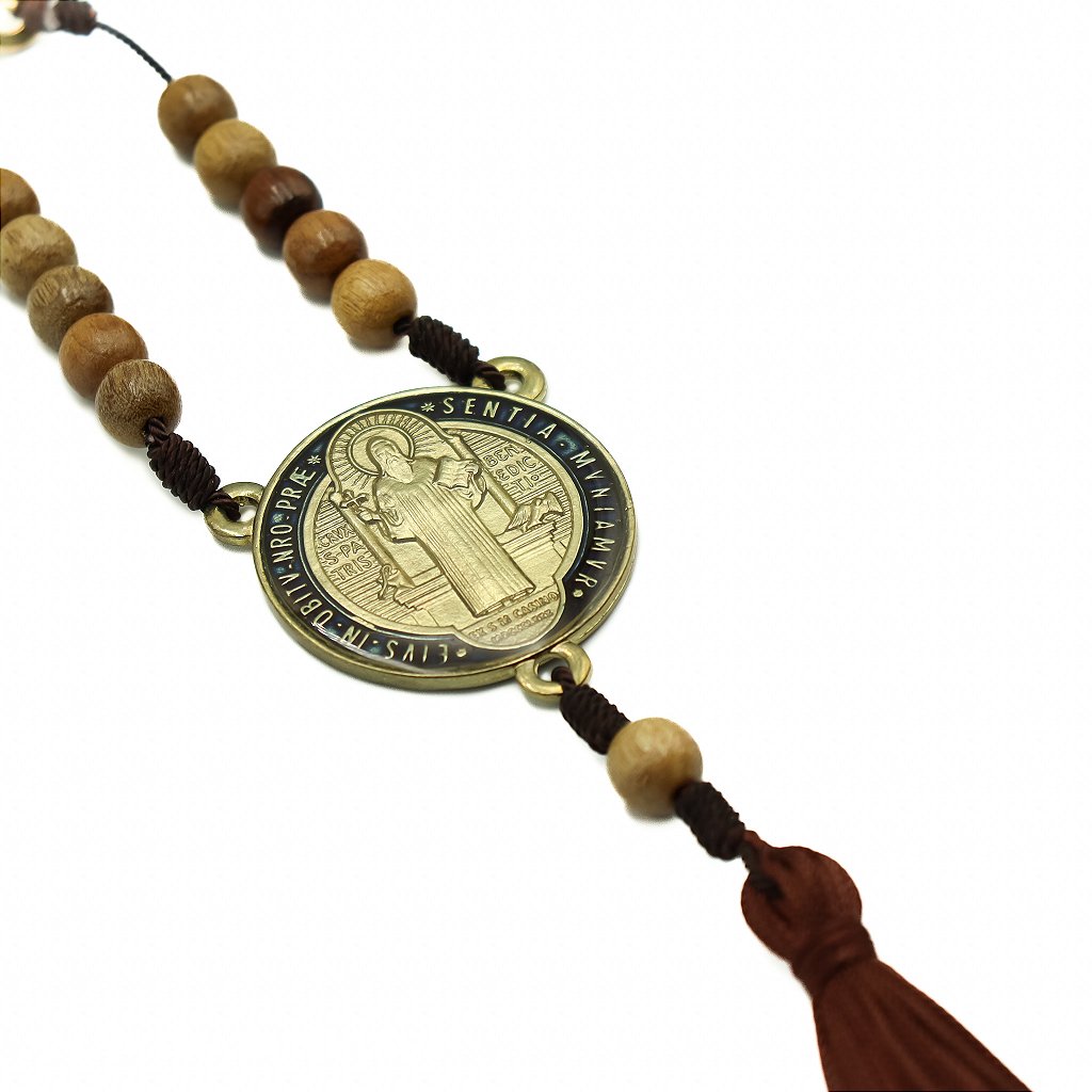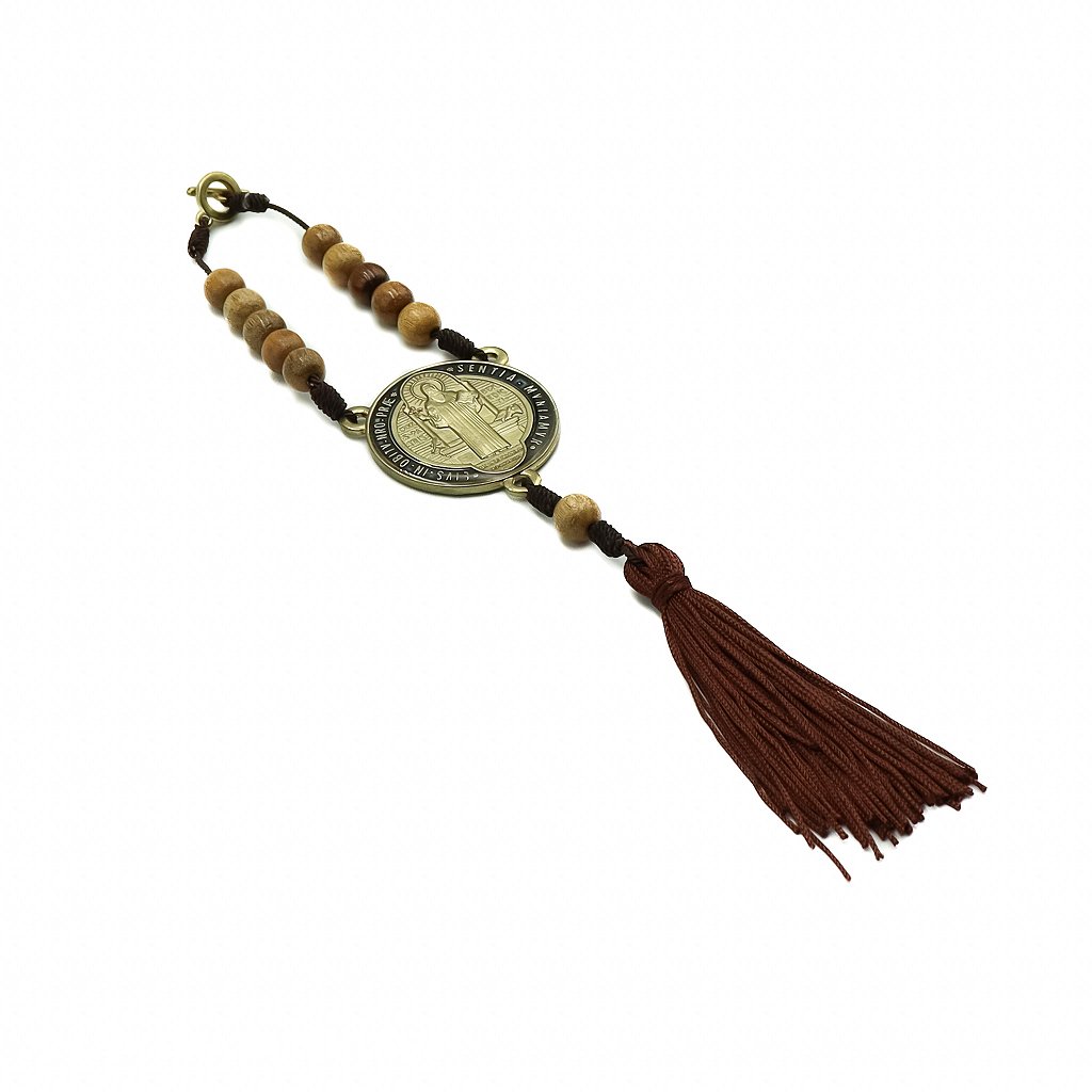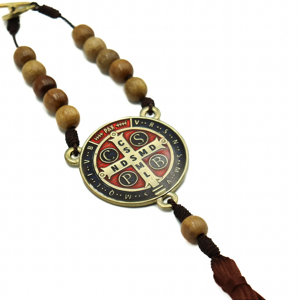 Confeccionado com contas de madeira na cor clara, fecho dourado, este adorno possui uma medalha de São Bento colorida com acabamento dourado e um tassel marrom, unindo estilo e devoção.