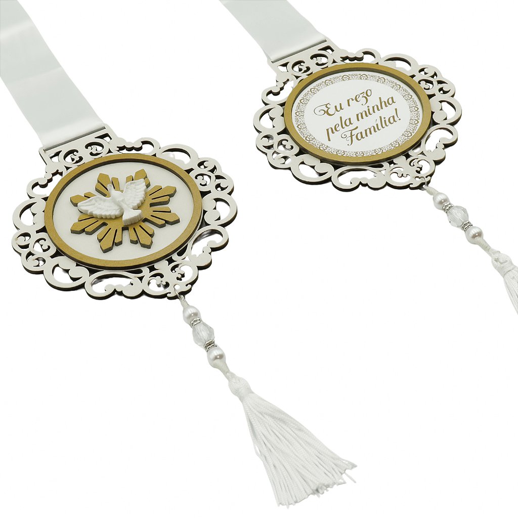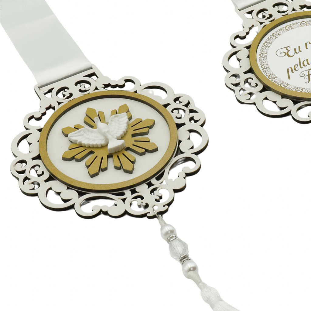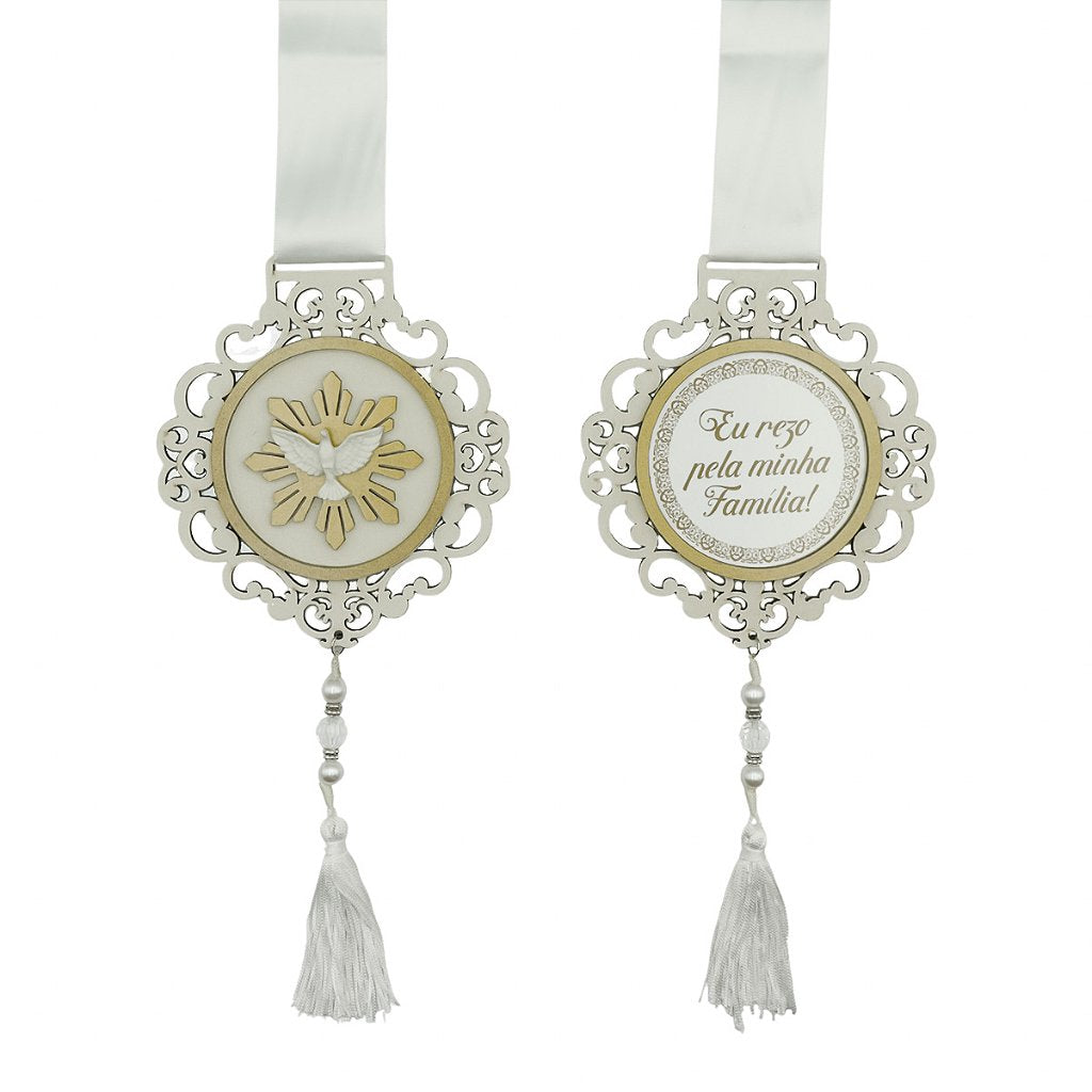 Com a imagem delicada do Espírito Santo — representado pela pomba branca — e uma frase especial de devoção, este escapulário nos lembra diariamente que não estamos sozinhos: Deus está sempre presente, derramando Seus dons sobre nós.