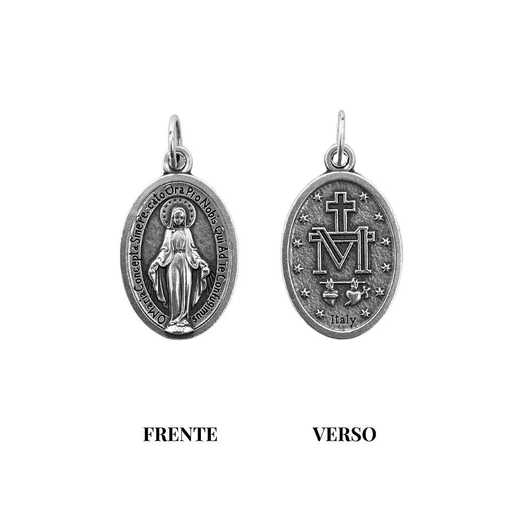 Esta Medalha Milagrosa de Nossa Senhora das Graças, com 2 cm de tamanho, é uma peça delicada e significativa, destaca-se pela sua beleza e simbolismo.