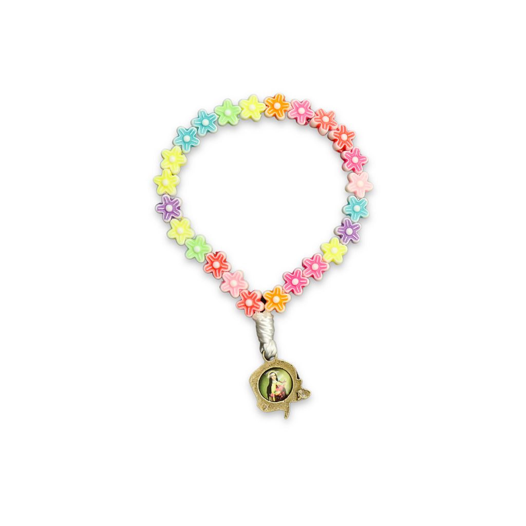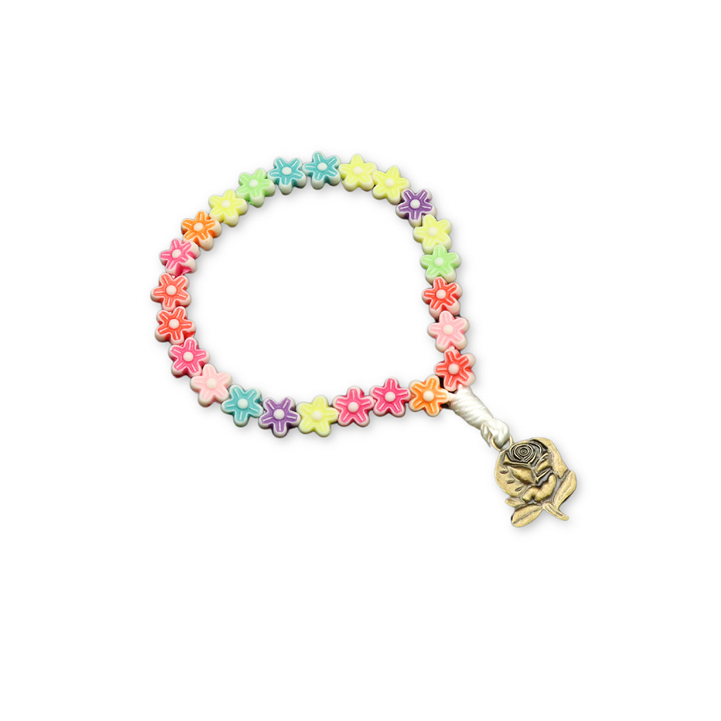 Com um design especial, suas contas em formato de flores de plástico 7 mm, e a medalha em formato de flor de 1,5 cm em prata velha, trazem delicadeza e significado à devoção. Com aproximadamente 10 cm de comprimento, é compacto e perfeito para levar consigo onde quiser.