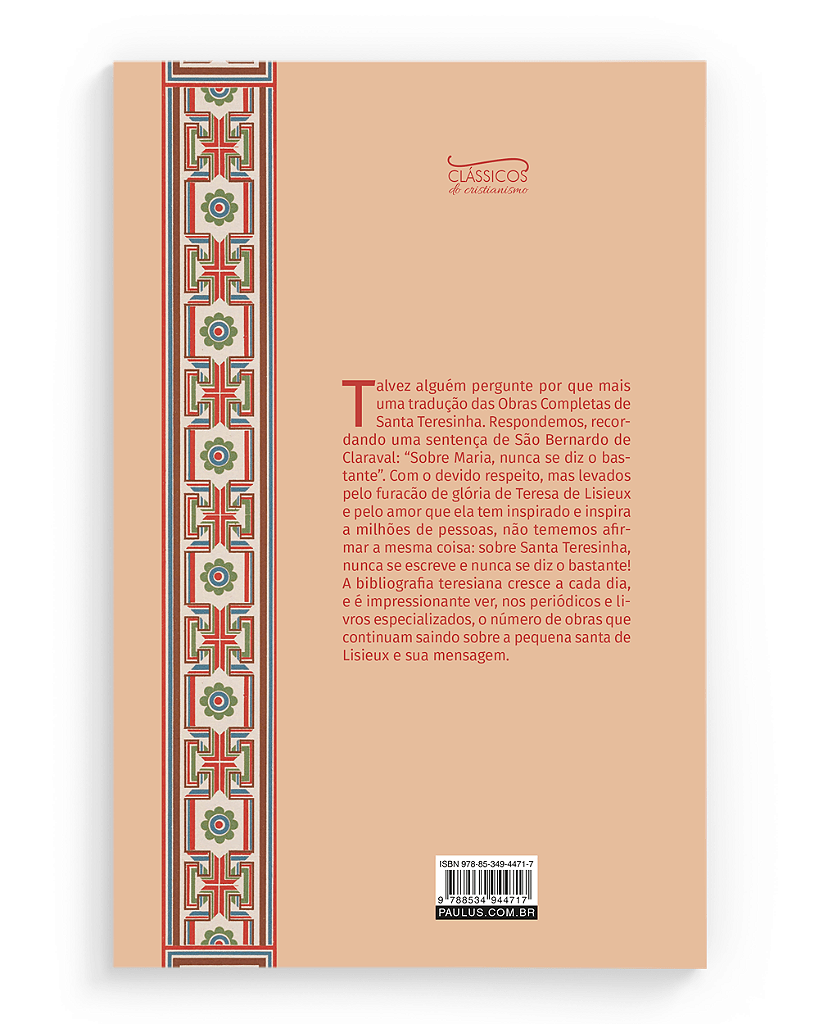 Em Obras completas, os leitores encontrarão: História de uma alma ou Manuscritos autobiográficos; 266 cartas; 8 peças de teatro; 54 poesias (com mais 8 composições poéticas adicionadas); 21 fórmulas oracionais e um apanhado de escritos variados, e Últimos colóquios. A obra conta, ainda, com um belíssimo caderno de fotos coloridas, que retratam momentos significativos da vida de Santa Teresinha, familiares, irmãs, amigos e amigas.Talvez uma das características mais valorosas dos escritos teresianos – ideia com a qual, inclusive, muitos críticos concordam – seja o lugar da experiência mística, onde se assenta o alicerce da espiritualidade de Santa Teresinha. Esse lugar é tudo e são todos, e ela trabalha e reza desde o seu cotidiano, quando contempla os problemas sociais de sua época, a vida compartilhada com as suas irmãs, em todas as suas nuances, até seus conflitos particulares. Em tudo ela é verdade, e possivelmente seja essa “vida comum” que faz de Santa Teresinha uma das santas mais amadas de todos os tempos, porque é alguém a quem é possível se assemelhar.