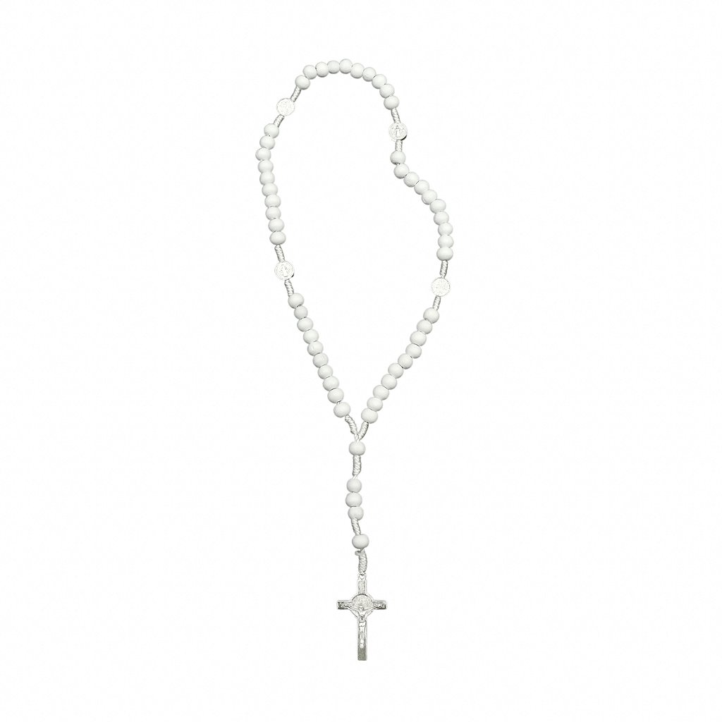 Terço madeira branca cordão branco com medalha São Bento na dezena