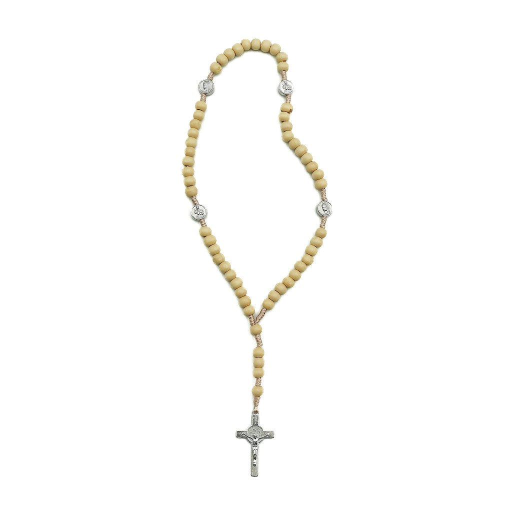 Terço madeira clara cordão bege claro medalha prateada na dezena - Medjugorje
