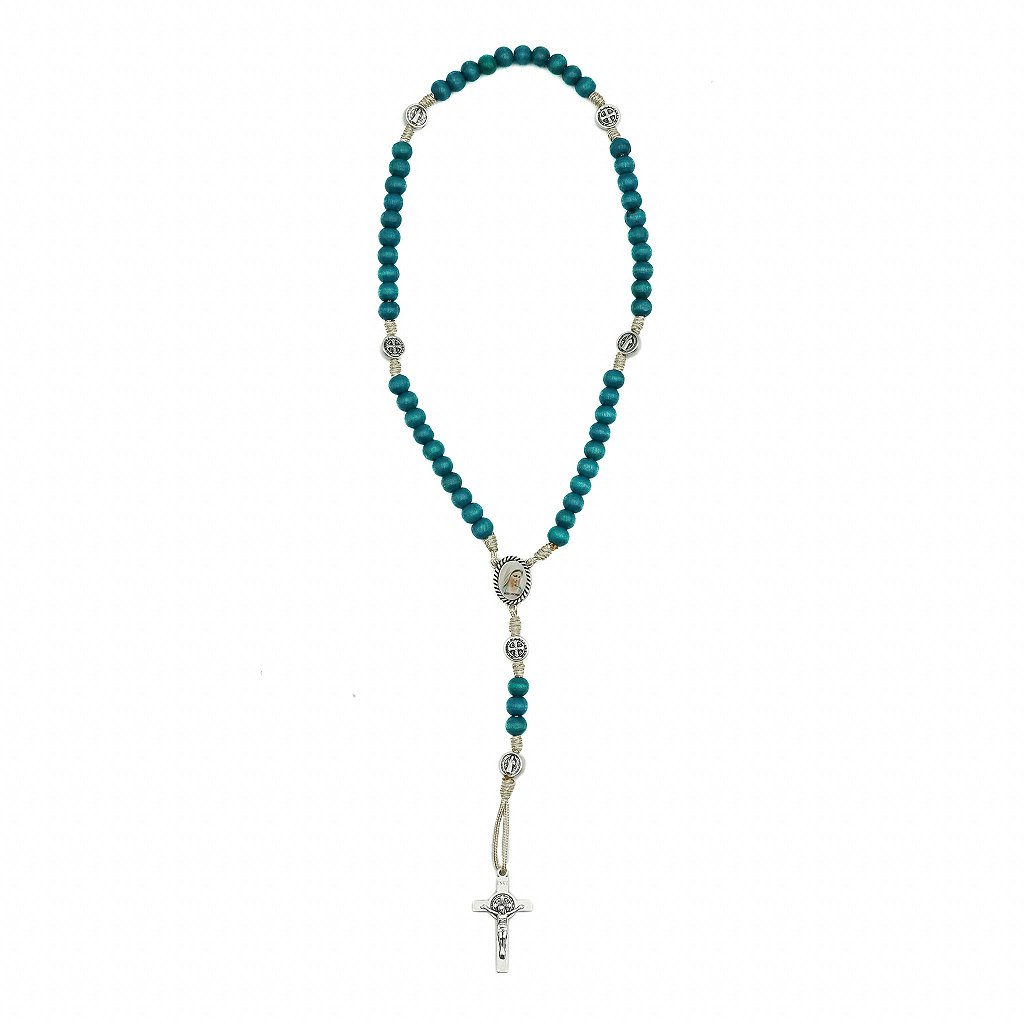 Terço madeira verde cordão bege claro entre meio Rainha da Paz / Jesus Misericordioso - Medjugorje